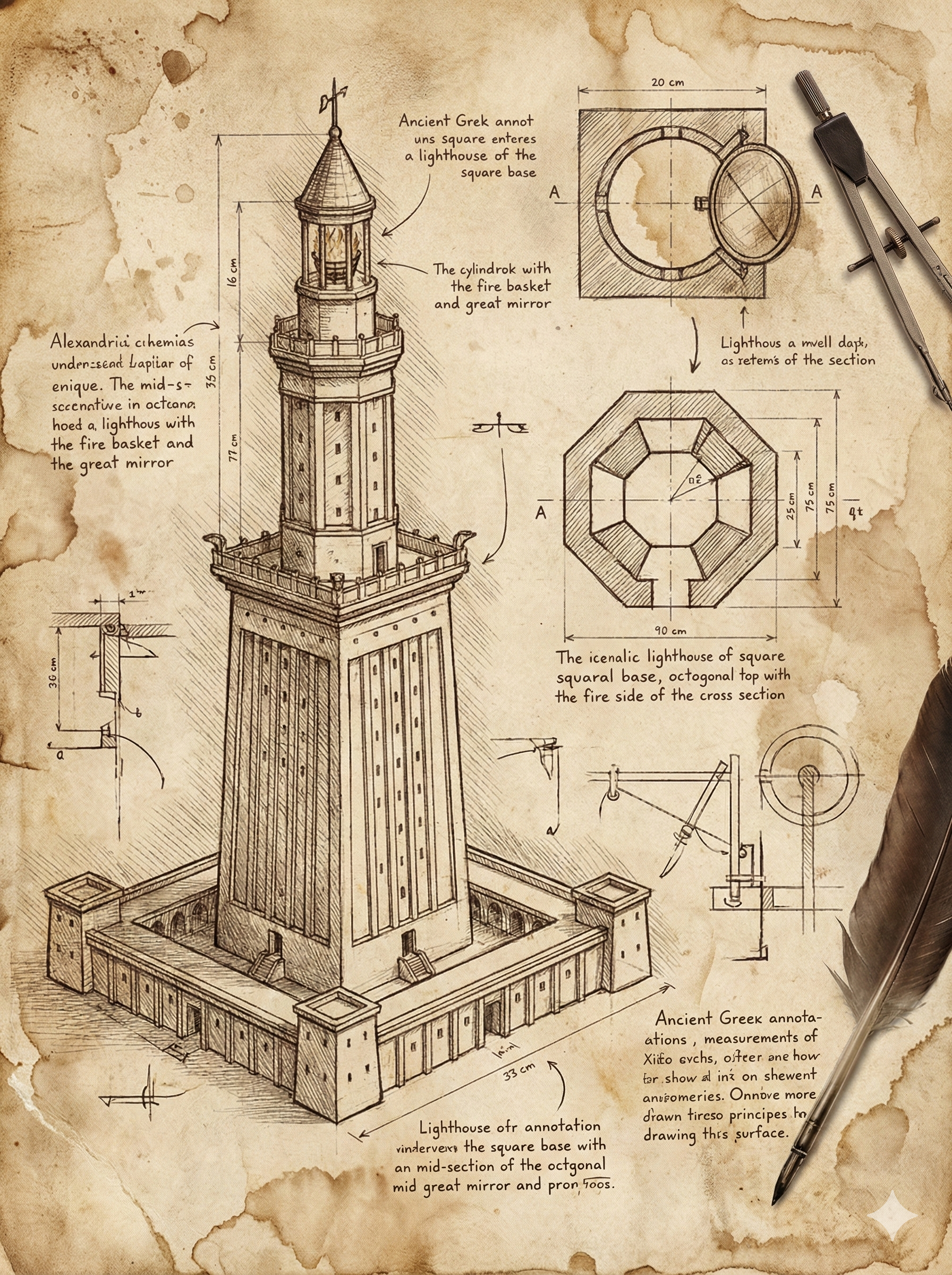 Fenerin asıl mucizesi yüksekliği değil, ışığıydı. Gündüzleri, tepesindeki devasa cilalı bronz ayna, güneş ışığını yansıtarak gemilere yol gösteriyordu. Geceleri ise reçine ve yağla beslenen dev bir ateş yakılıyordu.